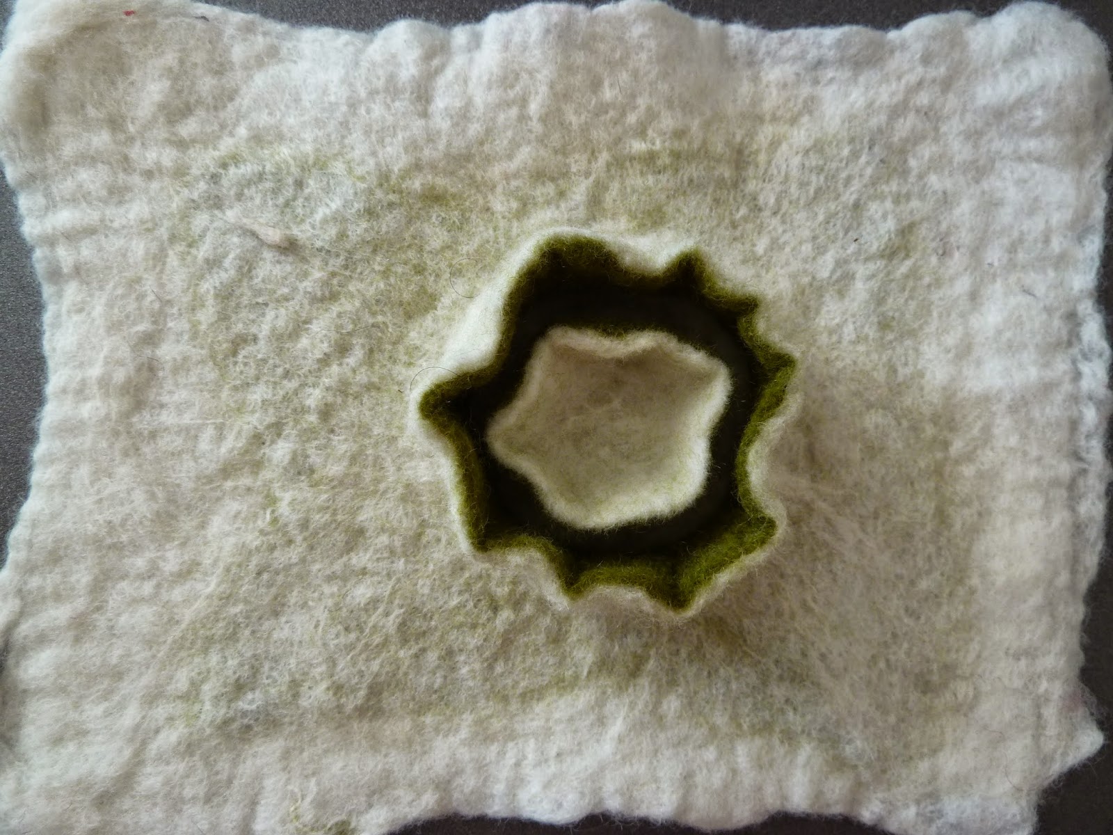 Een keer per maand komen we bijeen met een aantal viltsters uit Amsterdam in atelier Tetterode. Vandaag was het Willeke's beurt om de dag voor te bereiden. We hebben gevilt met een resist. We hadden een heerlijke dag.